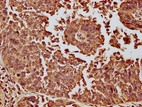 • IHC image of CSB-PA010087OA11nme1HU diluted at 1:10 and staining in paraffin-embedded human cervical cancer performed on a Leica BondTM system. After dewaxing and hydration, antigen retrieval was mediated by high pressure in a citrate buffer (pH 6.0). Section was blocked with 10% normal goat serum 30min at RT. Then primary antibody (1% BSA) was incubated at 4°C overnight. The primary is detected by a biotinylated secondary antibody and visualized using an HRP conjugated SP system.