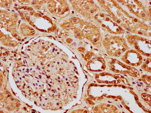 • IHC image of CSB-PA010087OA11nme1HU diluted at 1:10 and staining in paraffin-embedded human kidney tissue performed on a Leica BondTM system. After dewaxing and hydration, antigen retrieval was mediated by high pressure in a citrate buffer (pH 6.0). Section was blocked with 10% normal goat serum 30min at RT. Then primary antibody (1% BSA) was incubated at 4°C overnight. The primary is detected by a biotinylated secondary antibody and visualized using an HRP conjugated SP system.