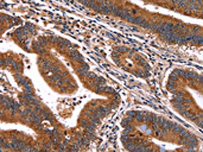 The image on the left is immunohistochemistry of paraffin-embedded Human colon cancer tissue using CSB-PA223356(HACE1 Antibody) at dilution 1/50, on the right is treated with synthetic peptide. (Original magnification: ×200)