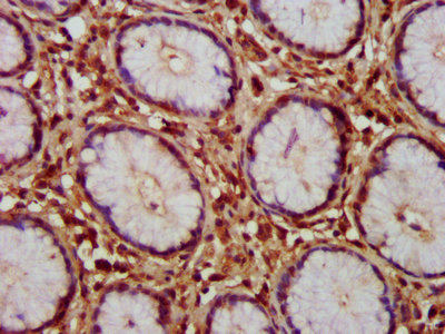 • IHC image of CSB-PA03515A0Rb diluted at 1:150 and staining in paraffin-embedded human gastric cancer performed on a Leica BondTM system. After dewaxing and hydration, antigen retrieval was mediated by high pressure in a citrate buffer (pH 6.0). Section was blocked with 10% normal goat serum 30min at RT. Then primary antibody (1% BSA) was incubated at 4°C overnight. The primary is detected by a biotinylated secondary antibody and visualized using an HRP conjugated SP system.