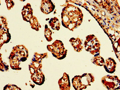 IHC image of CSB-PA010150LA01HU diluted at 1:300 and staining in paraffin-embedded human placenta tissue performed on a Leica BondTM system. After dewaxing and hydration, antigen retrieval was mediated by high pressure in a citrate buffer (pH 6.0). Section was blocked with 10% normal goat serum 30min at RT. Then primary antibody (1% BSA) was incubated at 4°C overnight. The primary is detected by a biotinylated secondary antibody and visualized using an HRP conjugated SP system.