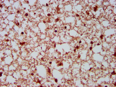 IHC image of CSB-PA889188LA01HU diluted at 1:500 and staining in paraffin-embedded human brain tissue performed on a Leica BondTM system. After dewaxing and hydration, antigen retrieval was mediated by high pressure in a citrate buffer (pH 6.0). Section was blocked with 10% normal goat serum 30min at RT. Then primary antibody (1% BSA) was incubated at 4°C overnight. The primary is detected by a biotinylated secondary antibody and visualized using an HRP conjugated SP system.