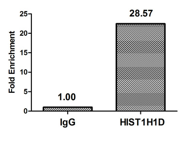 • Chromatin Immunoprecipitation Hela (4*106) were treated with Micrococcal Nuclease, sonicated, and immunoprecipitated with 5μg anti-HIST1H1D (CSB-PA010379OA179nphHU) or a control normal rabbit IgG. The resulting ChIP DNA was quantified using real-time PCR with primers against the β-Globin promoter.