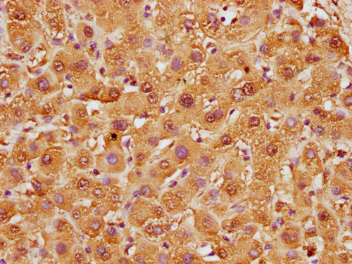 • IHC image of CSB-PA010380OA63nforHU diluted at 1:10 and staining in paraffin-embedded human liver tissue performed on a Leica BondTM system. After dewaxing and hydration, antigen retrieval was mediated by high pressure in a citrate buffer (pH 6.0). Section was blocked with 10% normal goat serum 30min at RT. Then primary antibody (1% BSA) was incubated at 4°C overnight. The primary is detected by a biotinylated secondary antibody and visualized using an HRP conjugated SP system.