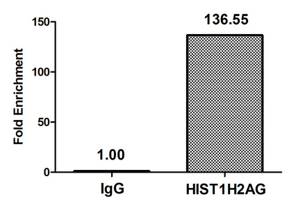 Chromatin Immunoprecipitation Hela (4*106) were treated with Micrococcal Nuclease, sonicated, and immunoprecipitated with 5µg anti-HIST1H2AG (CSB-PA010389OA13nacHU) or a control normal rabbit IgG. The resulting ChIP DNA was quantified using real-time PCR with primers against the β-Globin promoter.