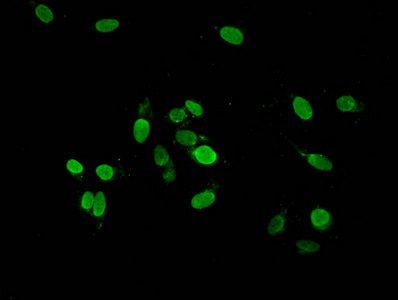 Immunofluorescent analysis of Hela cells using CSB-PA010389PA36ncrHU at dilution of 1:100 and Alexa Fluor 488-congugated AffiniPure Goat Anti-Rabbit IgG(H+L)