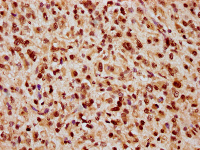 IHC image of CSB-PA010389OA09nbhbHU diluted at 1:20 and staining in paraffin-embedded human glioma performed on a Leica BondTM system. After dewaxing and hydration, antigen retrieval was mediated by high pressure in a citrate buffer (pH 6.0). Section was blocked with 10% normal goat serum 30min at RT. Then primary antibody (1% BSA) was incubated at 4°C overnight. The primary is detected by a biotinylated secondary antibody and visualized using an HRP conjugated SP system.