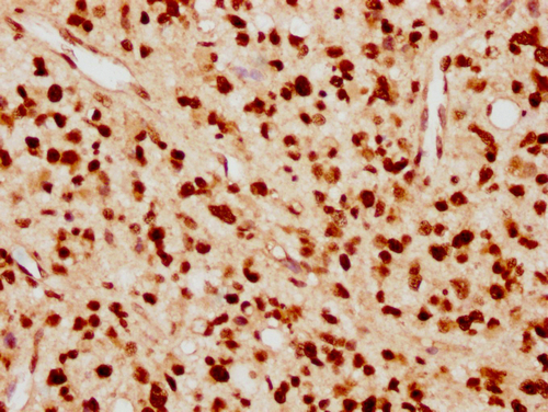 IHC image of CSB-PA010389PA09nacHU diluted at 1:10 and staining in paraffin-embedded human glioma cancer performed on a Leica BondTM system. After dewaxing and hydration, antigen retrieval was mediated by high pressure in a citrate buffer (pH 6.0). Section was blocked with 10% normal goat serum 30min at RT. Then primary antibody (1% BSA) was incubated at 4°C overnight. The primary is detected by a biotinylated secondary antibody and visualized using an HRP conjugated SP system.