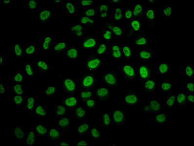 Immunofluorescence staining of Hela cells with CSB-PA010403OA05nforHU at 1:1.5, counter-stained with DAPI. The cells were fixed in 4% formaldehyde, permeabilized using 0.2% Triton X-100 and blocked in 10% normal Goat Serum. The cells were then incubated with the antibody overnight at 4°C. The secondary antibody was Alexa Fluor 488-congugated AffiniPure Goat Anti-Rabbit IgG(H+L).