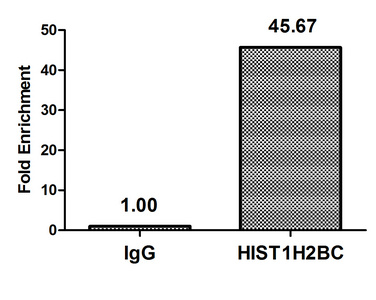 • Chromatin Immunoprecipitation Hela (4*106) were treated with Micrococcal Nuclease, sonicated, and immunoprecipitated with 5µg anti-HIST1H2BC (CSB-PA010403OA116nme1HU) or a control normal rabbit IgG. The resulting ChIP DNA was quantified using real-time PCR with primers against the β-Globin promoter.