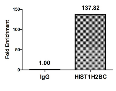 • Chromatin Immunoprecipitation Hela (4*106) were treated with Micrococcal Nuclease, sonicated, and immunoprecipitated with 5µg anti-HIST1H2BC (CSB-PA010403OA12nme1HU) or a control normal rabbit IgG. The resulting ChIP DNA was quantified using real-time PCR with primers against the β-Globin promoter.