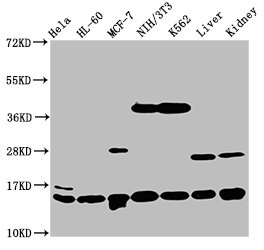 Positive WB detected in: Hela whole cell lysate, HL60 whole cell lysate, MCF-7 whole cell lysate, NIH/3T3 whole cell lysate, K562 whole cell lysate, Rat liver tissue, Mouse kidney tissue