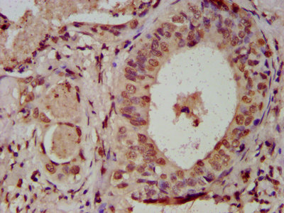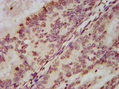 IHC image of CSB-PA010418OA122nhibHU diluted at 1:100 and staining in paraffin-embedded human endometrial cancer performed on a Leica BondTM system. After dewaxing and hydration, antigen retrieval was mediated by high pressure in a citrate buffer (pH 6.0). Section was blocked with 10% normal goat serum 30min at RT. Then primary antibody (1% BSA) was incubated at 4°C overnight. The primary is detected by a biotinylated secondary antibody and visualized using an HRP conjugated SP system.