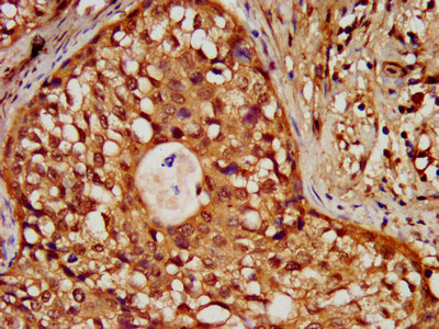 IHC image of CSB-PA010418OA18nforHU diluted at 1:30 and staining in paraffin-embedded human colon cancer performed on a Leica BondTM system. After dewaxing and hydration, antigen retrieval was mediated by high pressure in a citrate buffer (pH 6.0). Section was blocked with 10% normal goat serum 30min at RT. Then primary antibody (1% BSA) was incubated at 4°C overnight. The primary is detected by a biotinylated secondary antibody and visualized using an HRP conjugated SP system.