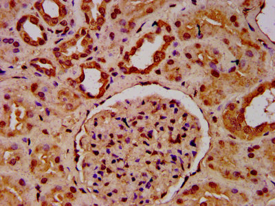 IHC image of CSB-PA010418OA23nhibHU diluted at 1:20 and staining in paraffin-embedded human kidney tissue performed on a Leica BondTM system. After dewaxing and hydration, antigen retrieval was mediated by high pressure in a citrate buffer (pH 6.0). Section was blocked with 10% normal goat serum 30min at RT. Then primary antibody (1% BSA) was incubated at 4°C overnight. The primary is detected by a biotinylated secondary antibody and visualized using an HRP conjugated SP system.