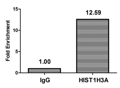 Chromatin Immunoprecipitation Hela (4*106) were treated with Micrococcal Nuclease, sonicated, and immunoprecipitated with 5µg anti-HIST1H3A (CSB-PA010418OA04nme2HU) or a control normal rabbit IgG. The resulting ChIP DNA was quantified using real-time PCR with primers against the β-Globin promoter.