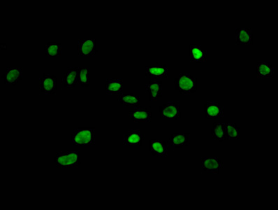 Immunofluorescent analysis of Hela cells using CSB-PA010418OA04nme2HU at dilution of 1:100 and Alexa Fluor 488-congugated AffiniPure Goat Anti-Rabbit IgG(H+L)