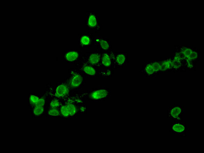 Immunofluorescent analysis of Hela cells using CSB-PA010418PA09nme2HU at dilution of 1:100 and Alexa Fluor 488-congugated AffiniPure Goat Anti-Rabbit IgG(H+L)