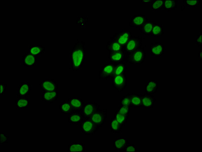 Immunofluorescence staining of Hela cells with CSB-PA010429OA05nhibHU at 1:1.5, counter-stained with DAPI. The cells were fixed in 4% formaldehyde, permeabilized using 0.2% Triton X-100 and blocked in 10% normal Goat Serum. The cells were then incubated with the antibody overnight at 4°C. The secondary antibody was Alexa Fluor 488-congugated AffiniPure Goat Anti-Rabbit IgG(H+L).