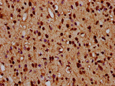 IHC image of CSB-PA010429OA05nhibHU diluted at 1:3 and staining in paraffin-embedded human glioma performed on a Leica BondTM system. After dewaxing and hydration, antigen retrieval was mediated by high pressure in a citrate buffer (pH 6.0). Section was blocked with 10% normal goat serum 30min at RT. Then primary antibody (1% BSA) was incubated at 4°C overnight. The primary is detected by a biotinylated secondary antibody and visualized using an HRP conjugated SP system.