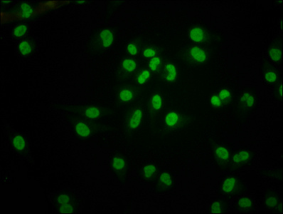 Immunofluorescence staining of Hela cells with CSB-PA010429OA05nbhbHU at 1:1, counter-stained with DAPI. The cells were fixed in 4% formaldehyde, permeabilized using 0.2% Triton X-100 and blocked in 10% normal Goat Serum. The cells were then incubated with the antibody overnight at 4°C. The secondary antibody was Alexa Fluor 488-congugated AffiniPure Goat Anti-Rabbit IgG(H+L).