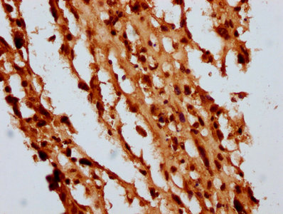 IHC image of CSB-PA010429OA05nbhbHU diluted at 1:10 and staining in paraffin-embedded human melanoma performed on a Leica BondTM system. After dewaxing and hydration, antigen retrieval was mediated by high pressure in a citrate buffer (pH 6.0). Section was blocked with 10% normal goat serum 30min at RT. Then primary antibody (1% BSA) was incubated at 4°C overnight. The primary is detected by a biotinylated secondary antibody and visualized using an HRP conjugated SP system.