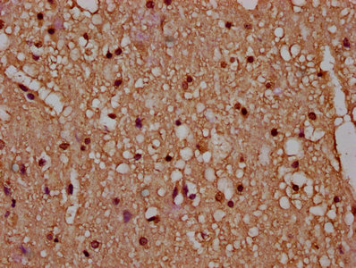 • IHC image of CSB-PA010429OA77nbhbHU diluted at 1:20 and staining in paraffin-embedded human brain tissue performed on a Leica BondTM system. After dewaxing and hydration, antigen retrieval was mediated by high pressure in a citrate buffer (pH 6.0). Section was blocked with 10% normal goat serum 30min at RT. Then primary antibody (1% BSA) was incubated at 4°C overnight. The primary is detected by a biotinylated secondary antibody and visualized using an HRP conjugated SP system.
