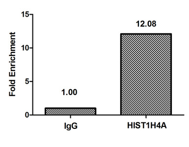 Chromatin Immunoprecipitation Hela (4*106) were treated with Micrococcal Nuclease, sonicated, and immunoprecipitated with 8µg anti-HIST1H4A (CSB-PA010429PA03nme1HU) or a control normal rabbit IgG. The resulting ChIP DNA was quantified using real-time PCR with primers against the β-Globin promoter.
