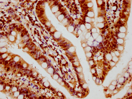 • IHC image of CSB-PA010429PA88nohHU diluted at 1:8 and staining in paraffin-embedded human small intestine tissue performed on a Leica BondTM system. After dewaxing and hydration, antigen retrieval was mediated by high pressure in a citrate buffer (pH 6.0). Section was blocked with 10% normal goat serum 30min at RT. Then primary antibody (1% BSA) was incubated at 4°C overnight. The primary is detected by a biotinylated secondary antibody and visualized using an HRP conjugated SP system.