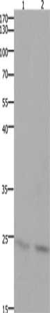Gel: 10%SDS-PAGE, Lysate: 30 μg, Lane 1-2: Mouse lung tissue, Mouse brain tissue, Primary antibody: CSB-PA780376(HMGB3 Antibody) at dilution 1/700, Secondary antibody: Goat anti rabbit IgG at 1/8000 dilution, Exposure time: 1.5 minutes