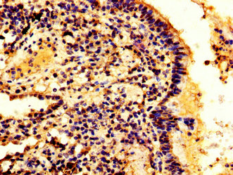 IHC image of CSB-PA010561LA01HU diluted at 1:300 and staining in paraffin-embedded human lung cancer performed on a Leica BondTM system. After dewaxing and hydration, antigen retrieval was mediated by high pressure in a citrate buffer (pH 6.0). Section was blocked with 10% normal goat serum 30min at RT. Then primary antibody (1% BSA) was incubated at 4°C overnight. The primary is detected by a biotinylated secondary antibody and visualized using an HRP conjugated SP system.