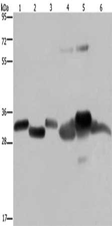 Gel: 8%SDS-PAGE, Lysate: 40 μg, Lane 1-6: Mouse thymus tissue, human ovarian cancer tissue, mouse heart tissue, human fetal liver tissue, mouse liver tissue, SKOV3 cells, Primary antibody: CSB-PA576264(HMGCL Antibody) at dilution 1/300, Secondary antibody: Goat anti rabbit IgG at 1/8000 dilution, Exposure time: 5 seconds