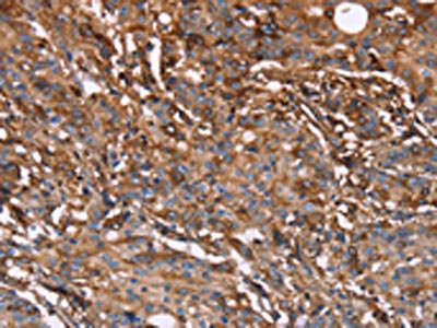 The image on the left is immunohistochemistry of paraffin-embedded Human gastic cancer tissue using CSB-PA790577(HP Antibody) at dilution 1/40, on the right is treated with synthetic peptide. (Original magnification: ×200)