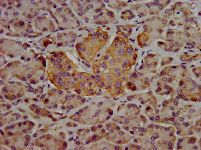• IHC image of CSB-PA010704LA01HU diluted at 1:400 and staining in paraffin-embedded human pancreatic tissue performed on a Leica BondTM system. After dewaxing and hydration, antigen retrieval was mediated by high pressure in a citrate buffer (pH 6.0). Section was blocked with 10% normal goat serum 30min at RT. Then primary antibody (1% BSA) was incubated at 4°C overnight. The primary is detected by a biotinylated secondary antibody and visualized using an HRP conjugated SP system.