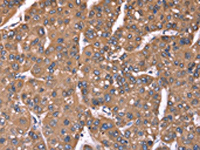 • The image on the left is immunohistochemistry of paraffin-embedded Human liver cancer tissue using CSB-PA589788(HRG Antibody) at dilution 1/50, on the right is treated with synthetic peptide. (Original magnification: ×200)