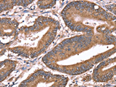 • The image on the left is immunohistochemistry of paraffin-embedded Human colon cancer tissue using CSB-PA589788(HRG Antibody) at dilution 1/50, on the right is treated with synthetic peptide. (Original magnification: ×200)