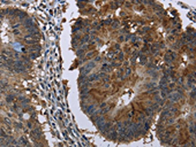 The image on the left is immunohistochemistry of paraffin-embedded Human colon cancer tissue using CSB-PA304268(HSD17B6 Antibody) at dilution 1/20, on the right is treated with fusion protein. (Original magnification: ×200)
