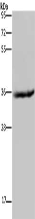 Gel: 10%SDS-PAGE, Lysate: 40 μg, Lane: Mouse liver tissue, Primary antibody: CSB-PA304268(HSD17B6 Antibody) at dilution 1/200, Secondary antibody: Goat anti rabbit IgG at 1/8000 dilution, Exposure time: 1 minute