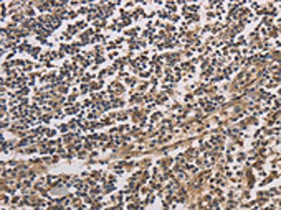The image on the left is immunohistochemistry of paraffin-embedded Human tonsil tissue using CSB-PA225962(HSF1 Antibody) at dilution 1/60, on the right is treated with fusion protein. (Original magnification: ×200)