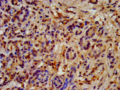 IHC image of CSB-PA00109A0Rb diluted at 1:200 and staining in paraffin-embedded human pancreatic cancer performed on a Leica BondTM system. After dewaxing and hydration, antigen retrieval was mediated by high pressure in a citrate buffer (pH 6.0). Section was blocked with 10% normal goat serum 30min at RT. Then primary antibody (1% BSA) was incubated at 4°C overnight. The primary is detected by a biotinylated secondary antibody and visualized using an HRP conjugated SP system.