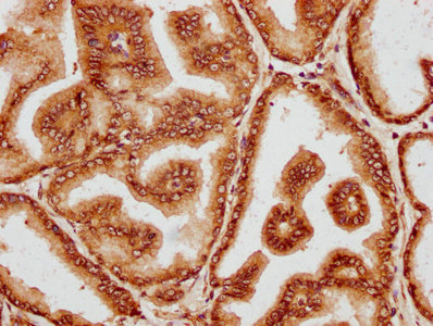 IHC image of CSB-PA844090LA01HU diluted at 1:400 and staining in paraffin-embedded human prostate tissue performed on a Leica BondTM system. After dewaxing and hydration, antigen retrieval was mediated by high pressure in a citrate buffer (pH 6.0). Section was blocked with 10% normal goat serum 30min at RT. Then primary antibody (1% BSA) was incubated at 4°C overnight. The primary is detected by a biotinylated secondary antibody and visualized using an HRP conjugated SP system.