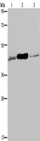 Gel: 8%SDS-PAGE, Lysate: 40 μg, Lane 1-3: 293T cells, Jurkat cells, human fetal muscle tissue, Primary antibody: CSB-PA586287(IDH2 Antibody) at dilution 1/600, Secondary antibody: Goat anti rabbit IgG at 1/8000 dilution, Exposure time: 10 seconds
