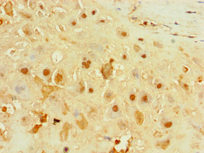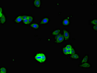 • Immunofluorescent analysis of HepG2 cells using CSB-PA880143LA01HU at dilution of 1:100 and Alexa Fluor 488-congugated AffiniPure Goat Anti-Rabbit IgG(H+L)