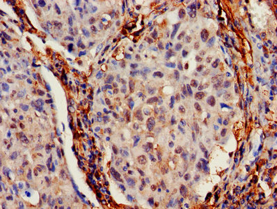 IHC image of CSB-PA011025LA01HU diluted at 1:700 and staining in paraffin-embedded human lung cancer performed on a Leica BondTM system. After dewaxing and hydration, antigen retrieval was mediated by high pressure in a citrate buffer (pH 6.0). Section was blocked with 10% normal goat serum 30min at RT. Then primary antibody (1% BSA) was incubated at 4°C overnight. The primary is detected by a biotinylated secondary antibody and visualized using an HRP conjugated SP system.