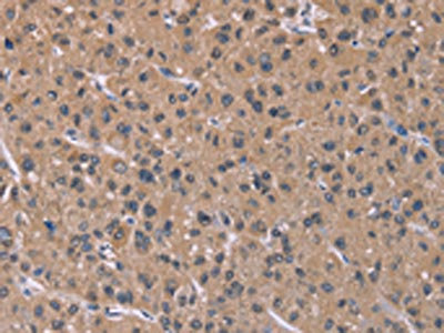 The image on the left is immunohistochemistry of paraffin-embedded Human liver cancer tissue using CSB-PA048892(IFNA2 Antibody) at dilution 1/40, on the right is treated with synthetic peptide. (Original magnification: ×200)
