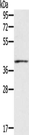 • Gel: 8%SDS-PAGE, Lysate: 60 μg, Lane: Mouse muscle tissue, Primary antibody: CSB-PA149561(IFNGR2 Antibody) at dilution 1/200, Secondary antibody: Goat anti rabbit IgG at 1/8000 dilution, Exposure time: 1 minute