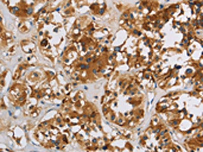 The image on the left is immunohistochemistry of paraffin-embedded Human thyroid cancer tissue using CSB-PA632749(IGF2R Antibody) at dilution 1/50, on the right is treated with synthetic peptide. (Original magnification: ×200)