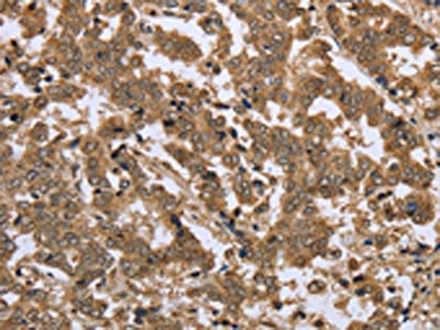 The image on the left is immunohistochemistry of paraffin-embedded Human liver cancer tissue using CSB-PA987228(IKBKE Antibody) at dilution 1/25, on the right is treated with fusion protein. (Original magnification: ×200)