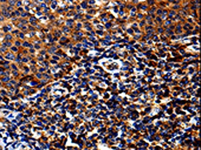 The image on the left is immunohistochemistry of paraffin-embedded Human tosil tissue using CSB-PA058807(IL13RA1 Antibody) at dilution 1/50, on the right is treated with fusion protein. (Original magnification: ×200)