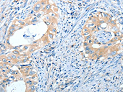 The image on the left is immunohistochemistry of paraffin-embedded Human cervical cancer tissue using CSB-PA239289(IL13RA2 Antibody) at dilution 1/30, on the right is treated with fusion protein. (Original magnification: ×200)
